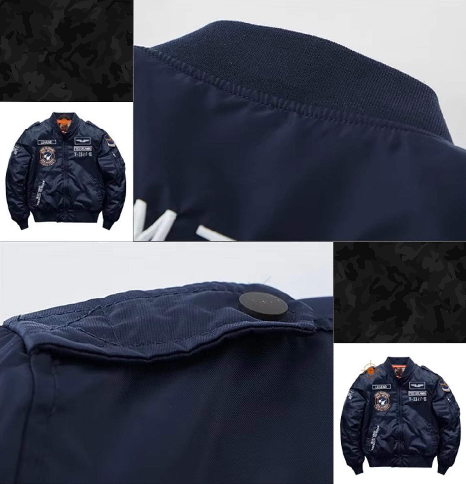 - Embroidered aviation patches & military-style detailing